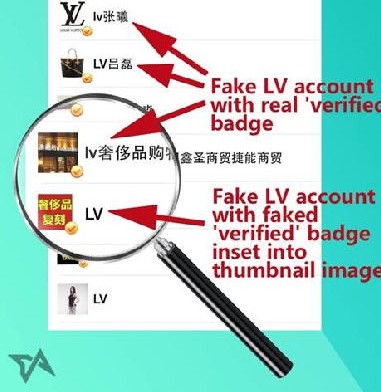 面对以上这两个例子说明消费者要知道微信平台上并不是所有的黄色验证标志都是对的,所谓被核实和验证过的帐户并不是真正的LV的帐户,而是销售包括LV在内的包包等奢侈品(很可能是假冒的)的网商。只有经常关注微信平台相关信息,获取正确的方法,防止遭遇假冒问题。