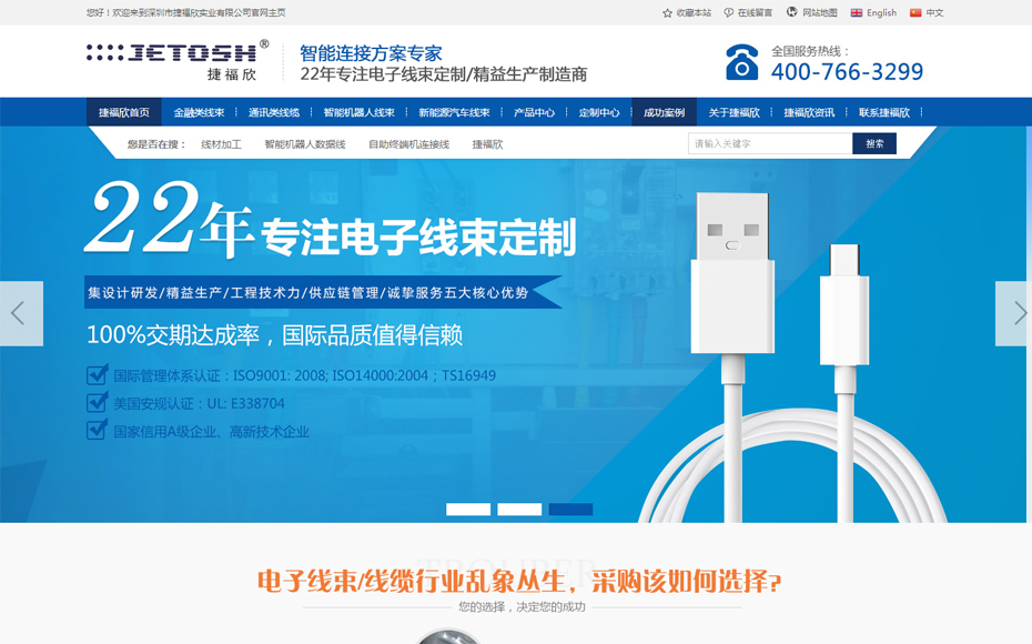 深圳市捷福欣实业有限公司成立于2001年,是集生产、研发、销售为一体,专业从事电子线束和连接器开发、制造及销售的生产型企业。公司拥有完整、科学的生产和管理体系,通过了ISO9001国际质量管理体系认证、ISO14001环境管理体系认证、UL美国安规认证。配备大量先进、专业的生产和测试设备,不断引进一流技术人员、优秀管理人才、先进的管理模式和经营理念。